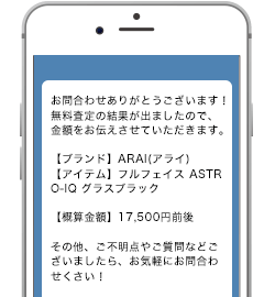 写真を撮って送るだけの簡単3ステップ!概算査定額をご連絡させていただきます。最終査定額につきましては、商品をお送り頂いてからの再査定でお伝えさせていただきます。